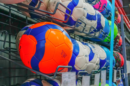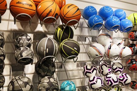 Umea, Sweden - August 29, 2019: many different balls in a sports shop