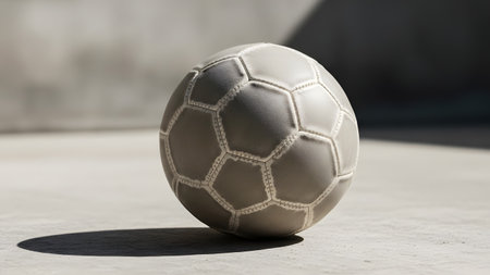 An old, worn-out soccer ball resting on a concrete pavement surface, casting a sharp shadow. The textured, greyish ball evokes a sense of street sports, urban play, and nostalgia.