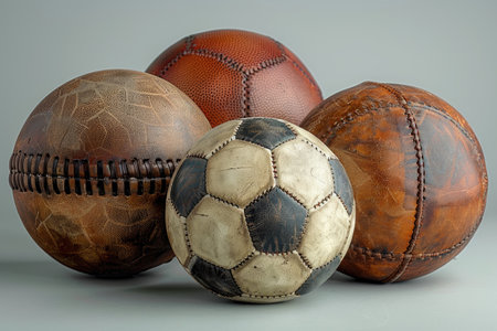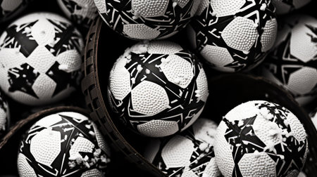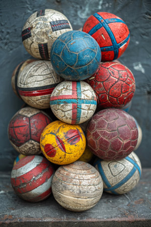 A pile of old soccer balls stacked on top of each other, AI