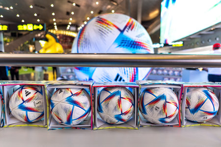 Adidas Al Rihla the official match ball of the 2022 FIFA World Cup in Qatar displayed at the Hamad International Airport in Doha, Qatar on 3 December 2022