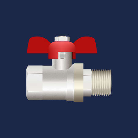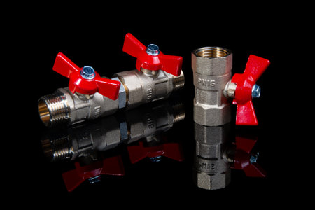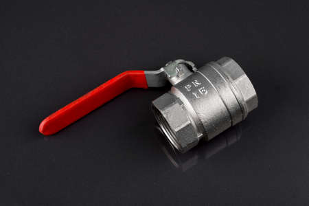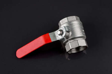 Ball valve with red handle on dark background. Selective focus with shallow depth of field.