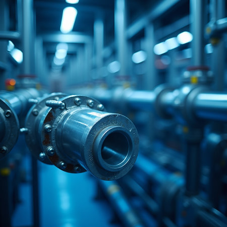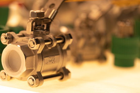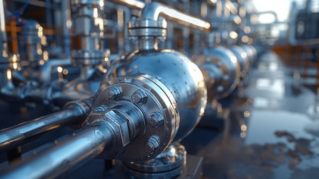 High-quality close-up image showcasing modern metallic equipment with intricate valve and pipe connections, set in an industrial environment.