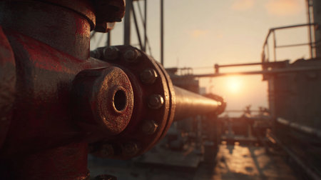 Atmospheric shot of industrial pipeline system with sunset over sea location.
