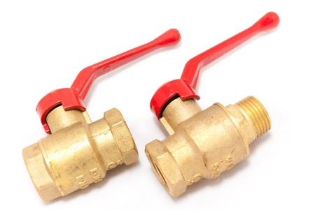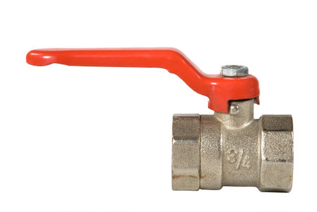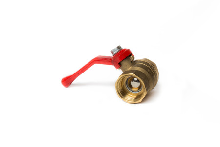Bronze ball valve half an inches with red handle for water with male hand close-up on isolated background. Plumbing details