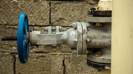 Industrial valves, shut off and closed, large Steel Manual Water control valve with small valves on Metal wall of a big reservoir