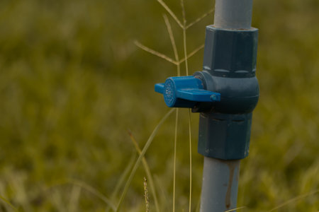 The image features metallic valves with orange handles, situated near a water flow, surrounded by greenery, capturing a serene outdoor scene.