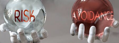 avoidance and risk in a balanced life - pictured as words avoidance,risk in hands to show that risk and avoidance should stay in balance, 3d illustration