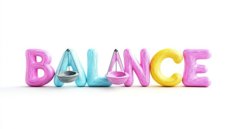 3D rendering of colorful word BALANCE with vintage scales, symbolizing harmony, on white background.