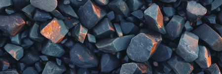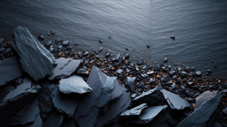 Jagged dark rock debris scattered unevenly over a smooth slate background for industrial textures