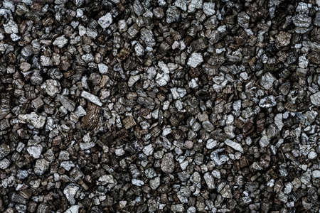 Road gravel and granite gravel texture. Crushed Gravel background. Pile of Stones texture. Industrial coals. Sun beam lights.