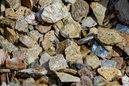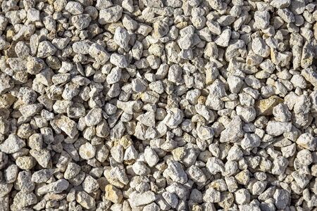 Wallpaper with gravel. Stone background. Texture of stones on a road lit by bright sunlight. Gravel texture. Building material for the road.
