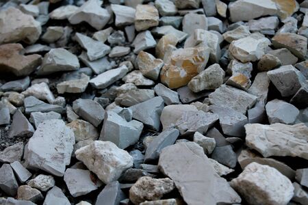 Limestone rubble. Construction material. Side lighting. Natural background. Selective focus. Close-up. Copy space.