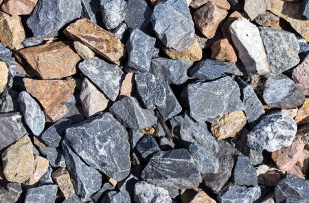 Close-up showcases a dense assortment of irregularly shaped rocks, varying in shades of brown, grey, and blue. Varied textures and natural patterns are visible across the rocks.