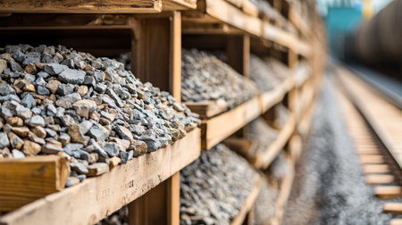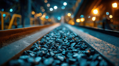 A captivating close-up image of coal resting on a railway track, set within an industrial environment. The blurred background features warm lighting, enhancing the mood and focus on the natural resource. Perfect for themes related to energy, mining, and transportation.