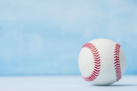 Baseball ball on wooden table and blue backgdound