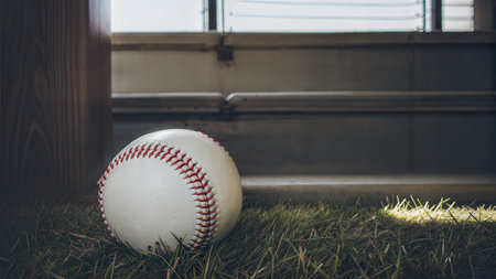 A close-up of a baseball resting on the grass near a dugout. The sun shines through a nearby window. Ai generated