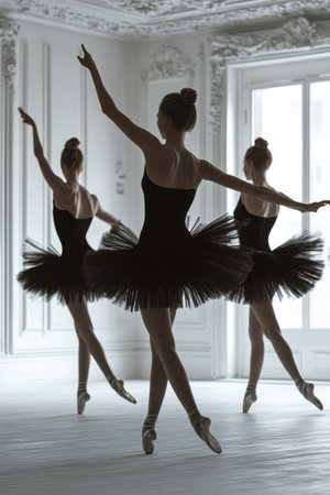 Three graceful ballet dancers in black tutus perform pirouettes in a bright studio. Soft light filters through large windows, highlighting their elegant movements and creating a serene atmosphere for practice.