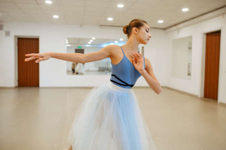 entertainment, art, choreography concept. gorgeous graceful ballerina dressed in blinding white ball gown dancing solo part all alone on the stage of the theater
