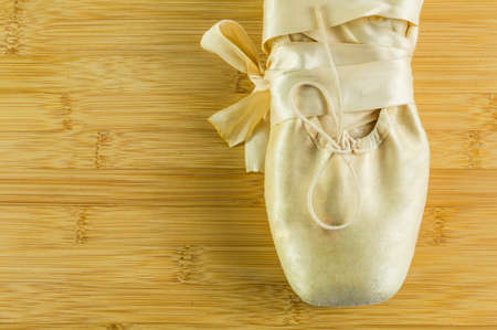 Pointe shoes on a wooden floor, ballet shoes, ballet hall, close-up, copy space, background.