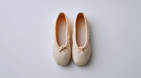 Simple ballet slippers for dance placed symmetrically on white studio surface with empty background