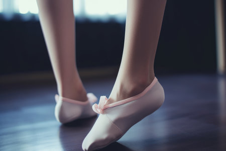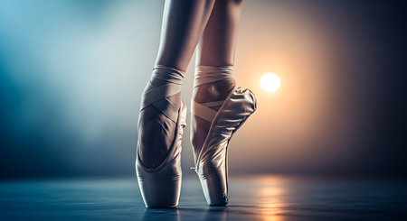 Graceful ballet dancer's feet in pointe shoes illuminated by dramatic stage light