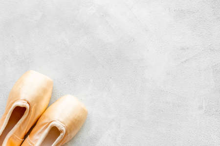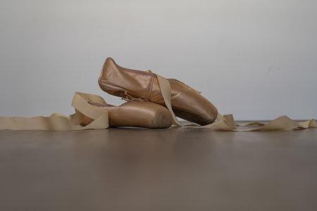 Pair of new untied pointe shoes of beige color with silk ribbons on the floor of dance hall or classroom for repetitions of ballet exercises