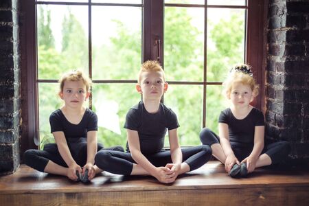 Portrait of 3 little children dancer two girls and one boy in black leotard sitting on window at dance studio. Recovery on dancing lesson. Kids hobby dancing. Active lifestyle in childhood