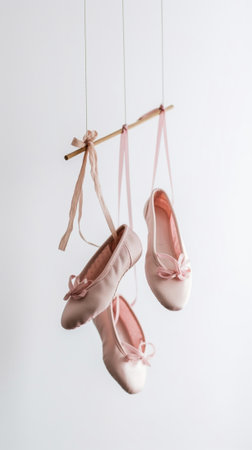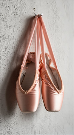 Pink ballet pointe shoes hanging on a textured wall. That the image is generated using AI.