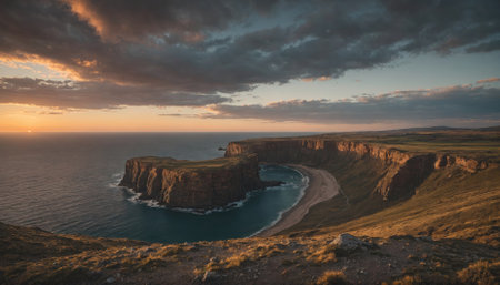 A scenic view of a coastal landscape in Scotland at sunset