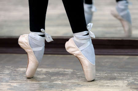 Close up view to ballerinas legs in white pointes on wooden floor in point position.