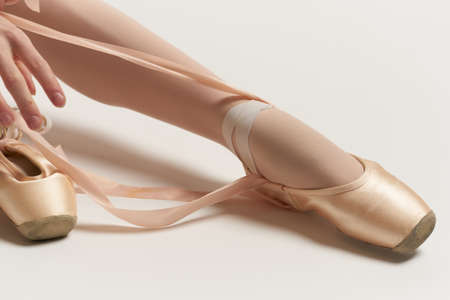 Ballerina puts pointe shoes on her feet White ribbon model dance light background.