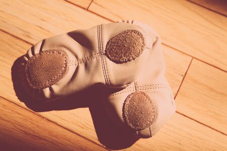 Background shot of beige satin pointe shoes decorated with elegant ribbons lying in sunlight on dark floor in dance studio, pointe shoes