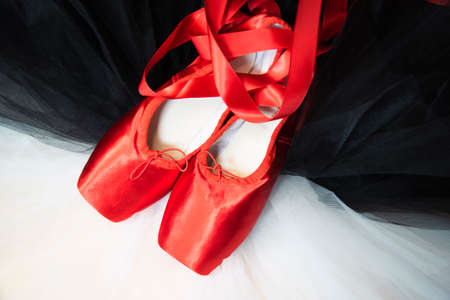 Red ballet pointe shoes resting on a white and black tutu.