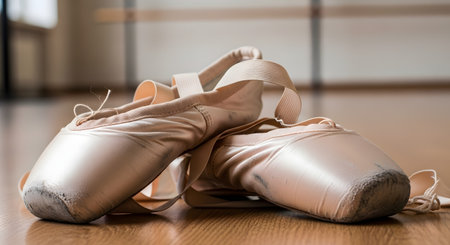 A pair of worn,pink satin pointe shoes rests on a wooden floor in a dance studio,with the barre visible in the background. The scuffed toes of the ballet slippers tell a story of dedication,hard work,practice,and the art of dance.