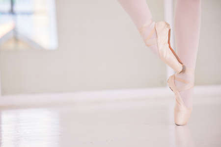Ballet feet or legs on the tiptoe dancing or practicing in a dance studio or class with copy space. Closeup of an elegant dancer or ballerina in pointe shoes preparing for a performance