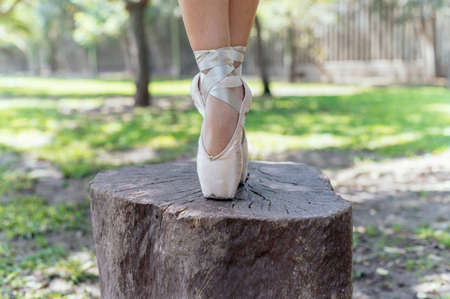 Close-up of the ballerinas feet on a log in the park.