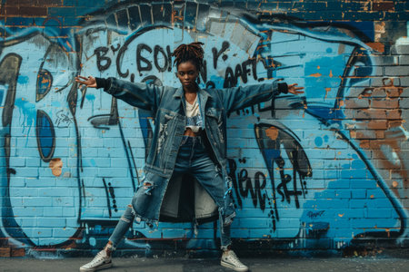 A fashionable woman in distressed denim strikes a confident pose in front of a colorful graffiti-covered wall.