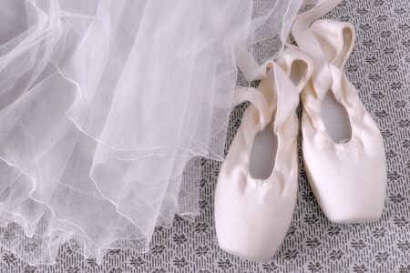 White ballet tutu skirt and beige pointe shoes with ribbon