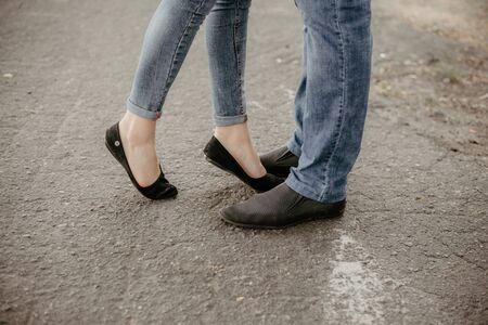 showing the feet of the young couple close together