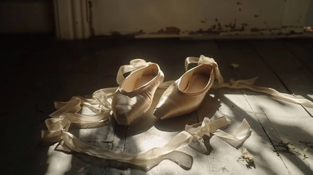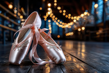Pointe shoes rest on a polished wooden floor, surrounded by soft glow of warm lights in a dance studio.