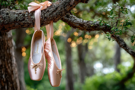 Delicate pink ballet shoes dangle from a tree branch, surrounded by soft bokeh lights in nature.