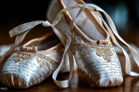 A close-up shot of a pair of ballet shoes, under bright, cold light, shot with a macro lens, with a surprise element of a hidden love note in them