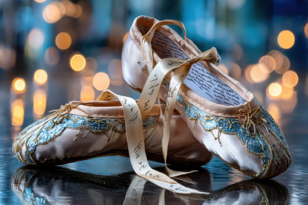 A pair of decorated ballet slippers on a reflective surface with bokeh lights