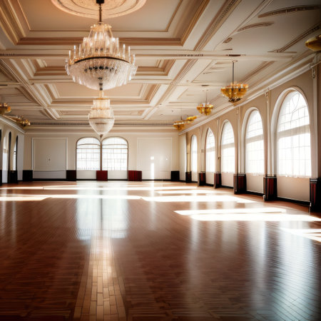 Opulent ballroom with crystal chandeliers, glossy floors, and table setups ready for event, completely empty