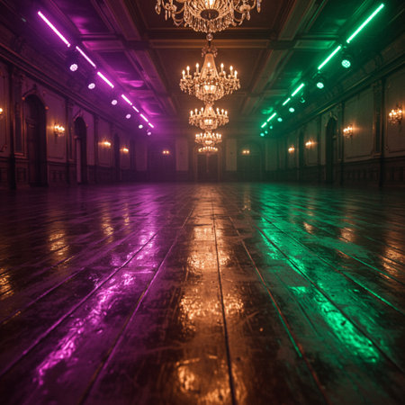 Interior of an old mansion with a wooden floor illuminated by neon lights