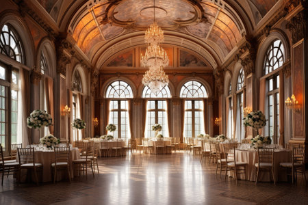A large ballroom with chandeliers and tables, perfect for hosting grand events and functions, A grand ballroom with golden chandeliers and large arched windows, AI Generated