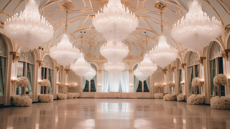 A luxurious wedding hall with an elegant chandelier, a white and beige color scheme, marble floors, crystal accents, vintage furniture, opulent decorations, the grandeur of the space, a professional photography style, soft lighting, a wide-angle shot capturing the entire room, natural daylight, and intricate details. --ar 3:2 --v 6.1 Job ID: 4572775e-0b7e-4ad8-a25d-5478759b7742