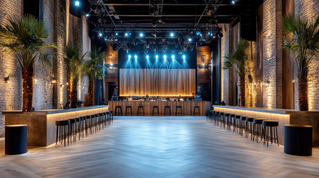 Dark modern concert music venue with an industrial atmosphere, ceiling lights shining onto the stage