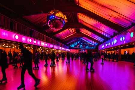 A vibrant roller disco with glowing neon accents, polished wooden floors reflecting multicolored lights, and silhouettes of people skating under a massive disco ball.