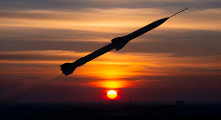 Vibrant ballistic missile launch with fiery engines blazing casting a dramatic plume of smoke in the dusky sky